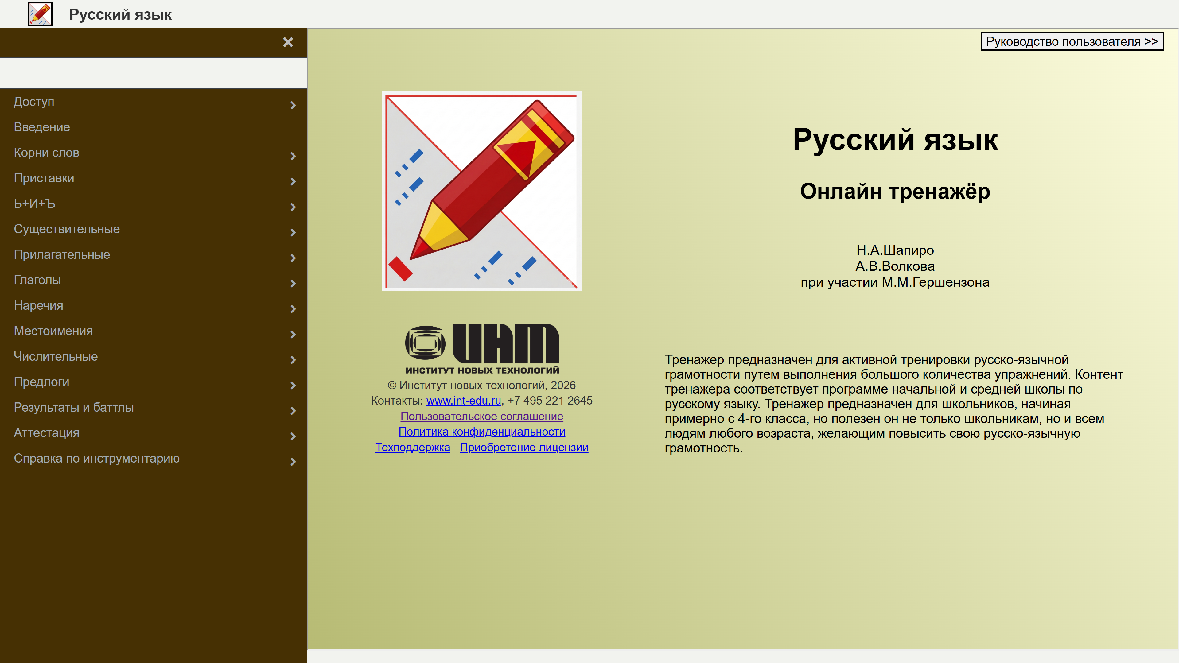 Онлайн тренажер охватывает все темы этих разделов, изучаемые с 5 по 9 класс и повторяемые в старших классах средней школы. Может использоваться на уроках, а также при выполнении домашних заданий и подготовке к проверочным работам. Учителя могут пользоваться им как справочным материалом. В комплект поставки входят инструкция и презентационный ролик с общей информацией о продукте и основных приемах работы с ним.