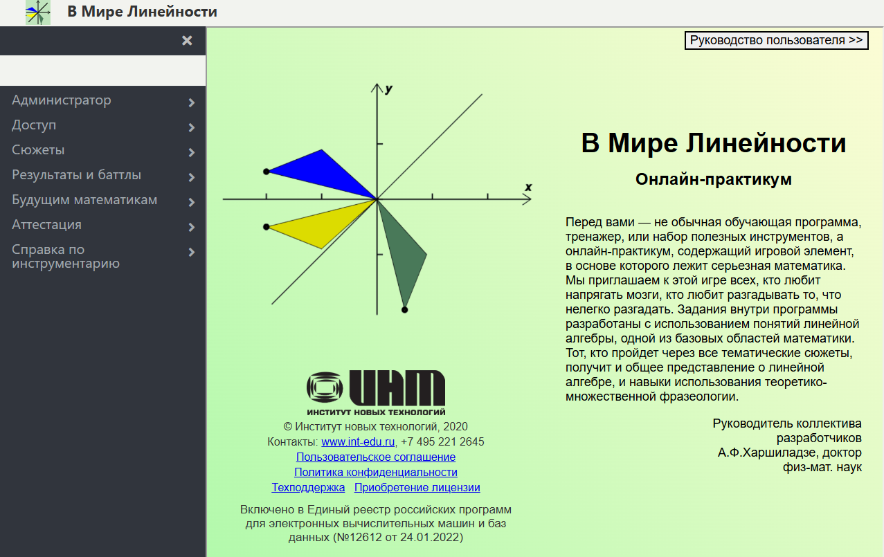 Практикум по математике, реализованный в виде веб-приложения, предназначен для знакомства учащихся 7–9 классов с теоретико-множественной фразеологией и началами линейной алгебры, одной из базовых областей математики. В качестве материала для тренинга выбраны множества точек на плоскости как наиболее простой и наглядный пример множеств, изображаемых на экране компьютера. Для выполнения заданий требуется наглядно-геометрическое представление и глазомер, а все вычисления сведены к минимуму. В процессе выполнения заданий учащиеся могут набирать баллы и вступать в соревнования друг с другом..